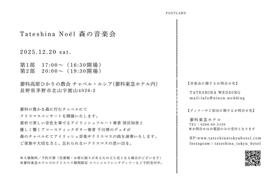 蓼科の豊かな森に佇むチャペル・ルシア(蓼科東急ホテル内)にてクリスマスコンサートを開催いたします。